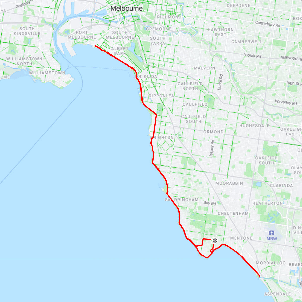 and Nepean Highway. Then another enthusiastic ride back to the CNR (Beaumaris). Distance circa 100km.