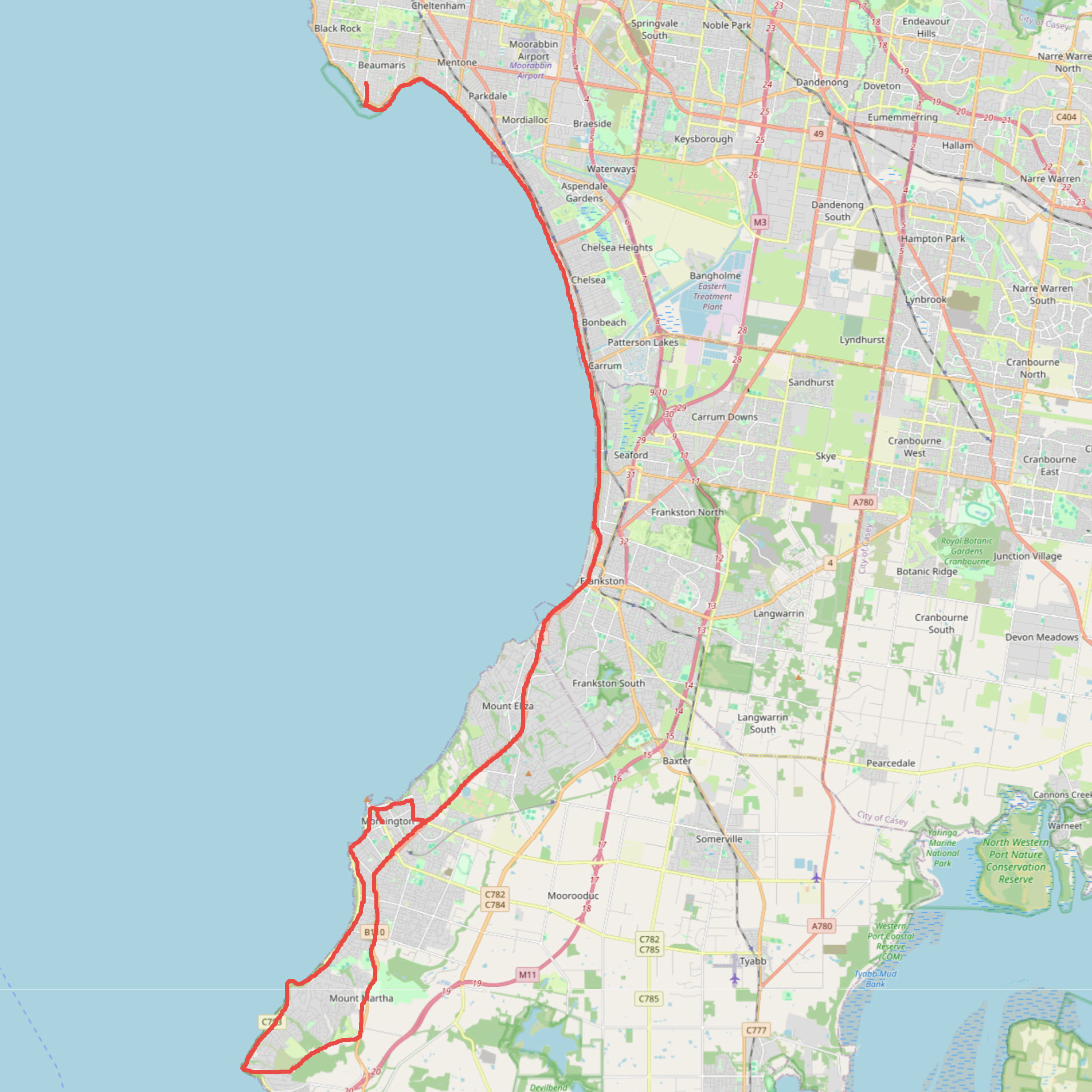 Starts as per Saturday but heads south to Frankston, again at a comfortable pace. It then goes up Oliver's Hill and Humphries Rd with a regroup at the top. Then down Humphries, Baden Powell, Nepean Highway, regroup if required at