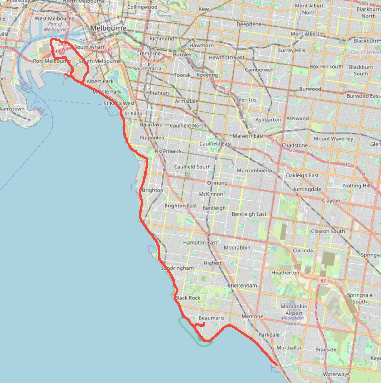 Follows Beach Road to Port Melbourne at around 30 kph, staying in a group with regular rotations. At Port Melbourne the group will split. "A" riders may do an additional circuit around Fisherman's Bend before returning south.