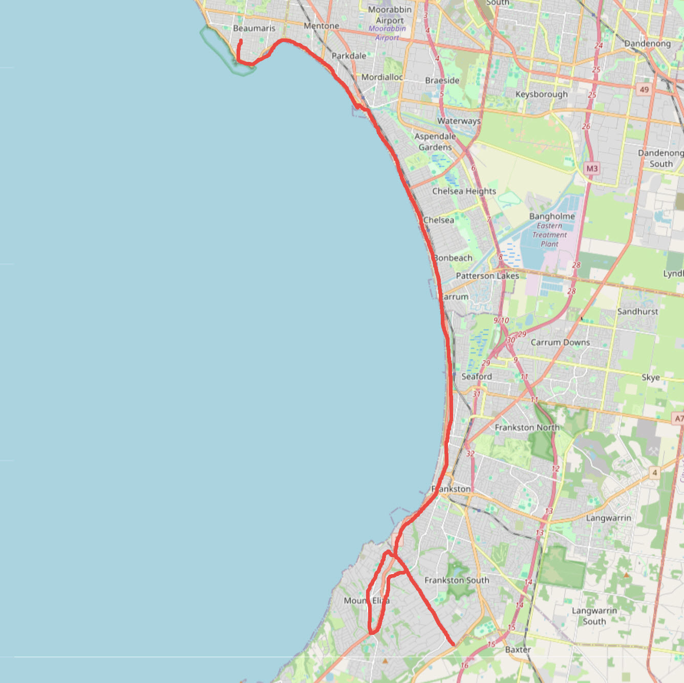 Mt Eliza Way, through Mt Eliza, Nepean Highway and a water stop and regroup at the BP, north side of Frankston CBD. Then back to the CNR (Beaumaris) usually at high effort!